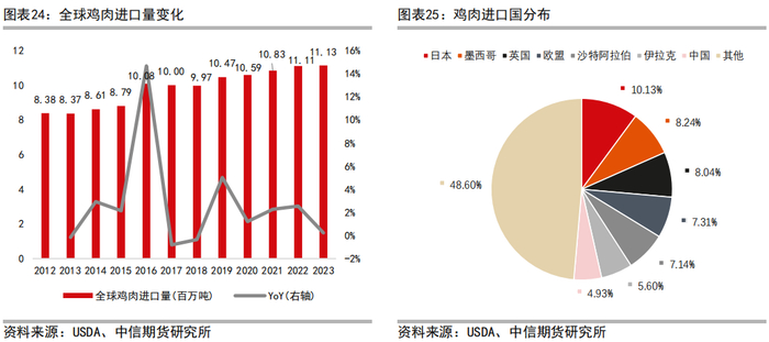 在国际贸易体系中,鸡肉的主要进口国有日本、墨西哥、英国、沙特阿拉伯、伊拉克和中国,这7个国家占全球进口总额的51.4%。其中日本占比为10.13%,为全球进口量最大的国家,中国进口占比为4.93%。