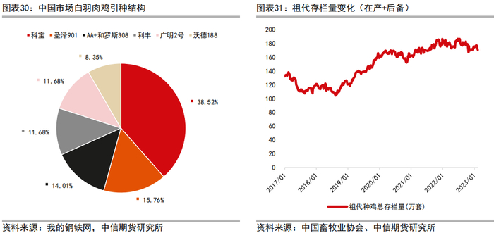 中国市场上主要的白羽肉鸡品种有科宝、AA+、圣泽901、罗斯308、利丰、广明2号、沃德188、哈伯德等,根据我的钢铁网的数据,2023年一季度引种总量占比最多的品种是科宝,占比约38.52%。自2021年12月国家畜禽遗传资源委员会审定通过“圣泽901”、“广明2号”、“沃德188”三种白羽肉鸡后,中国的白羽鸡育种市场成功打破国外垄断。