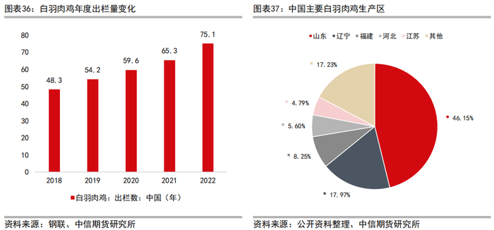 国内层面,我国白羽肉鸡历年祖代存栏在160-180万套左右,2022年白羽肉鸡年出栏量约75亿只。