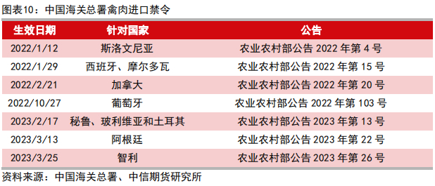 由于2022年以来国外禽流感形势严峻,为了防止疫情输入风险,我国海关总署颁布了一系列进口禁令措施。自2022年起到2023年8月30日,中国海关总署共发布了18条针对国外进口禽类产品的禁令,涉及欧洲和美洲等多个国家。