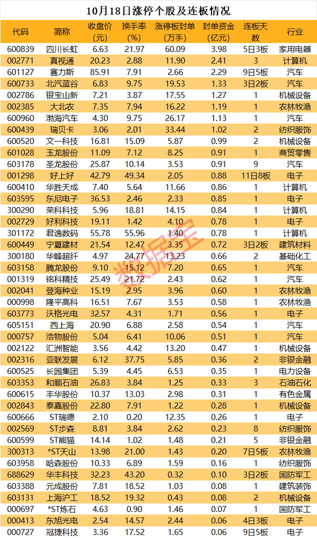 10月18日,A股三大指数集体收跌。个股方面,共43股涨停(包含5只ST股)。另外,8股封板未遂,整体封板率为82%。