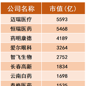 A股医疗企业市值排行榜:3000亿以上只剩一颗独苗