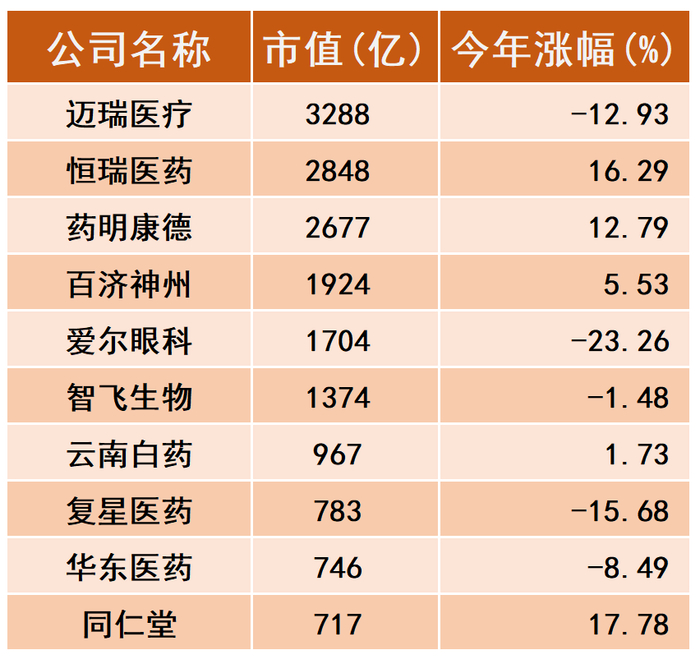 在经历了2年多的漫漫熊途之后,A股医疗板块的市值Top10企业,整个名单的变化并不是很大,依然是老面孔居多。