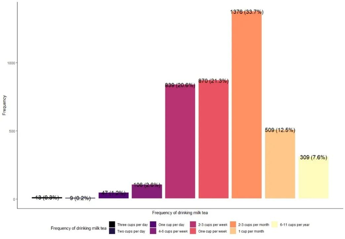 几乎一半的受访者表示,他们每周至少喝一杯奶茶。其中,2.6% 的青少年每周喝4至6杯奶茶,20.6%的青少年每周喝2至3杯奶茶。这一发现为所有人敲响了警钟,因为奶茶不仅在中国,而且在全世界都备受欢迎。