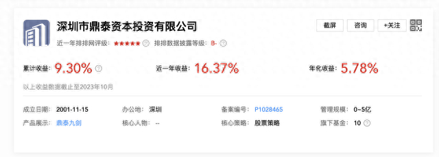 官网信息显示,鼎泰资本成立于2001年,前身为深圳市盈信投资集团子公司深圳市巨万实业公司,从事股权类的对外投控业务。2016年转型成为专业资产管理公司,同年七月正式发行阳光私募证券投资基金“鼎泰一期”,取得大幅超越市场的回报。