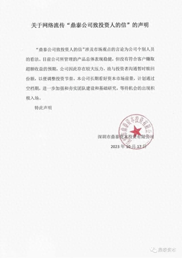 10月17日晚间,鼎泰资本在其官方微信发布声明称,因没有符合客户赚取超额收益的预期,公司存在较大压力,与投资者沟通暂时赎回份额,以便调整投资节奏。但是,“鼎泰公司致投资人的信”涉及市场观点的言论为公司个别人员的看法。目前公司所管理的产品总体表现稳健。