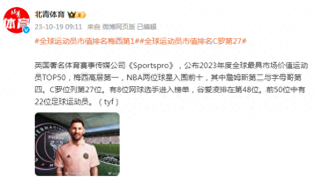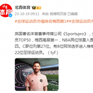 英国著名体育赛事传媒公司《Sportspro》,公布2023年度全球最具市场价值运动员TOP50,梅西高居第一,NBA两位球星入围前十,其中詹姆斯第二与字母哥第四。C罗位列第27位。有8位网球选手进入榜单,谷爱凌排在第48位。前50位中有22位足球运动员。