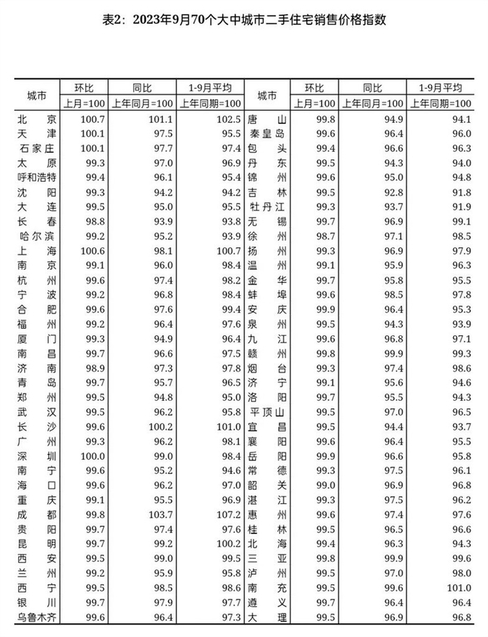 从环比看,9月份,二线城市新建商品住宅销售价格环比下降0.3%,降幅比上月扩大0.1个百分点;二手住宅环比下降0.5%,降幅与上月相同。三线城市新建商品住宅销售价格环比下降0.3%,降幅比上月收窄0.1个百分点;二手住宅环比下降0.5%,降幅比上月扩大0.1个百分点。从同比看,9月份,二线城市新建商品住宅销售价格同比上涨0.2%,涨幅比上月回落0.1个百分点;二手住宅同比下降3.2%,降幅比上月扩大0.2个百分点。三线城市新建商品住宅和二手住宅销售价格同比分别下降1.4%和3.5%,降幅均与上月相同。9月份,70个大中城市中,新建商品住宅销售价格同比下降城市有45个,比上月增加1个,较年内高点减少10个;二手住宅销售价格同比下降城市有67个,比上月增加1个。