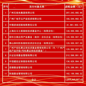 在本次发行中,公司控股股东广州无线电集团有限公司及其全资子公司广州广电平云产业投资有限公司合计认购发行数量的26.02%,中移资本控股有限责任公司、上海北斗七星股权投资基金中心(有限合伙)、国华卫星应用产业基金(南京)合伙企业(有限合伙)、佛山保利防务股权投资合伙企业(有限合伙)、广州产投私募证券投资基金管理有限公司、中信建投证券股份有限公司等其他9名投资者通过竞价成为公司本次股票发行对象,彰显了对海格通信高质量发展前景的信心。