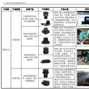 弘景光电主要产品包括智能汽车光学镜头及摄像模组和新兴消费光学镜头及摄像模组,其中智能汽车产品应用于智能座舱、智能驾驶,新兴消费产品应用于智能家居、全景/运动相机和其他产品。