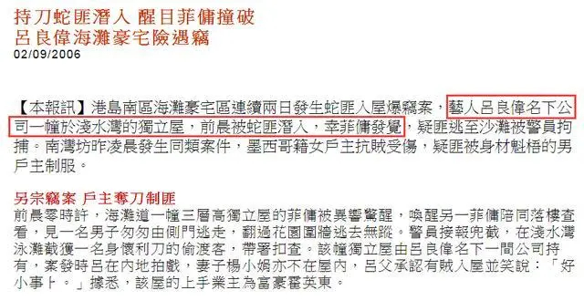 2006年时,一起偷窃事件,曾让吕良伟的豪宅被迫曝光。据报道,他在浅水湾的3层豪宅遭窃,所幸小偷刚潜入就被菲佣发现,并没造成经济损失。而浅水湾正是香港顶级的富人住宅区。