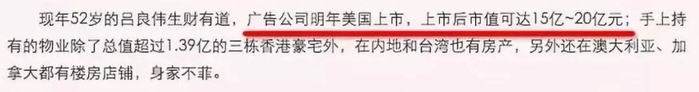 十余年前,曾有港媒报道称,吕良伟在多地都有房产,经营的触动传媒年赚2亿,身价可能已达数十亿!巅峰时期,他还上过求职综艺《非你莫属》,并在节目中透露,广告公司将会在美国纳斯达克上市。
