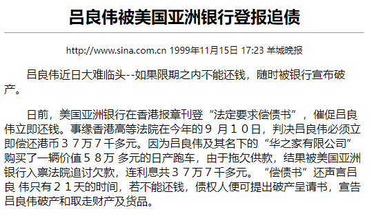 两年后,美国的亚洲银行还曾向吕良伟追讨37万港元欠款。据说,拿不出这笔钱的吕良伟只能宣布破产,并与家人搬出了豪宅,将房子卖了还债。