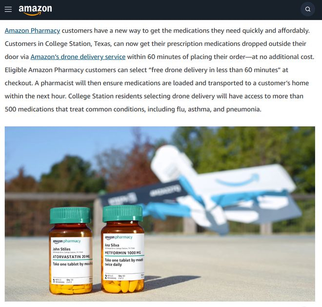 处方药下单一小时送达,亚马逊在美国部分地区推出无人机送药服务