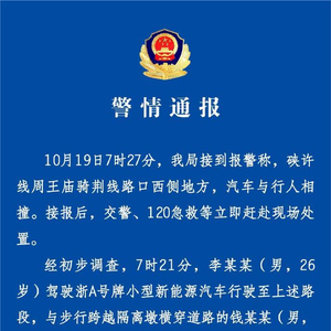 @海宁公安 微博发布警情通报,10月19日7时27分,我局接到报警称,硖许线周王庙骑荆线路口西侧地方,汽车与行人相撞。接报后,交警、120急救等立即赶赴现场处置。