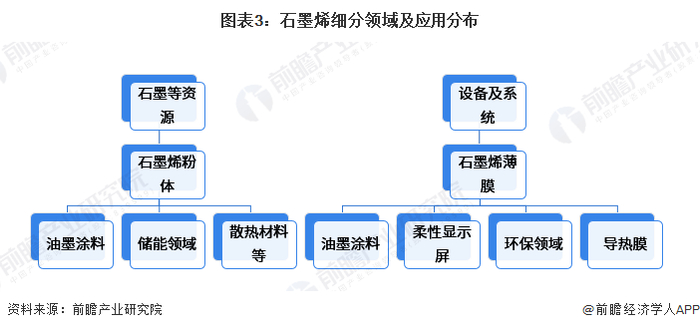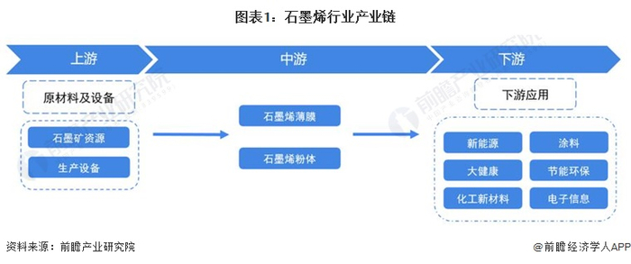 石墨烯产业链的上游为石墨矿资源及生产设备;中游为石墨烯薄膜和石墨烯粉体制造;下游主要的应用以新能源、涂料、大健康、节能环保、化工新材料、电子信息等六大产业。