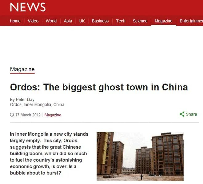 两年后,英国BBC又发表了一篇题为《鄂尔多斯:中国最大的鬼城》的报道,再一步增强了外界对鄂尔多斯的种种猜测。