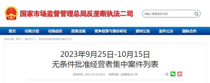 2023年9月25日-10月15日无条件批准经营者集中案件列表