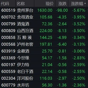 白酒股尽数下跌。其中,龙头贵州茅台大跌5.67%,最新价1630元/股。对此,茅台回应媒体称,公司已关注到股价波动,目前生产经营正常。其后舍得酒业、酒鬼酒、山西汾酒、五粮液、泸州老窖、金徽酒等一众白酒股跟跌,幅度均在3%以上。