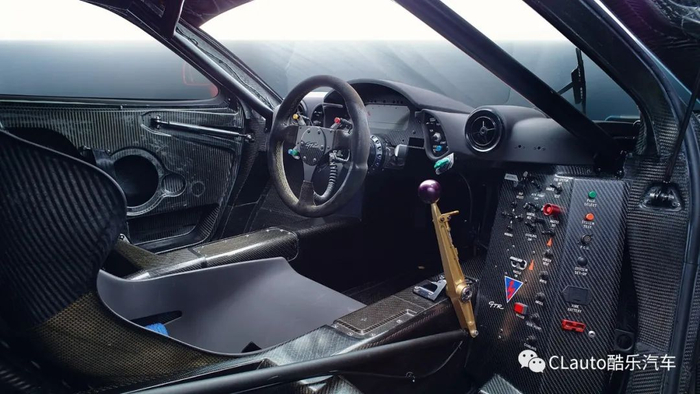 车内采用了大量Alcantara和碳纤维装饰面板,中控台配备了翻毛皮材质和碳纤维材质的方向盘、数字仪表盘以及炮筒式空调出风口,一体式的赛车座椅采用了四点式蓝色安全带,能将驾驶员牢牢地固定在座位上。