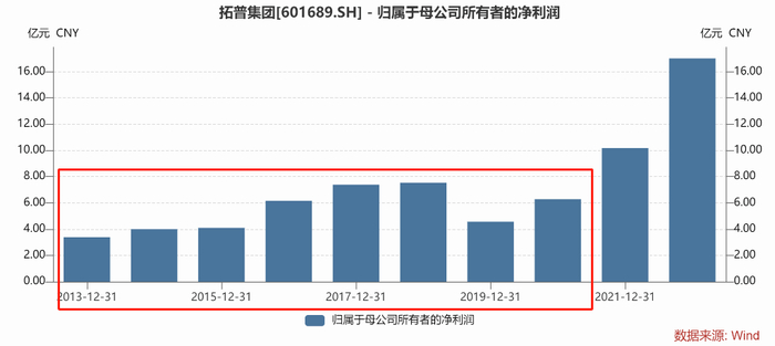 复盘拓普集团上市至今的成长路径,清晰可见的是,2015-2019年,拓普集团的市值稳稳的趴在100-200亿。因为汽车零部件属于传统行业,资产重,研发投入高,赚的都是辛苦钱,观察2013-2020年的归母净利润,可以看出拓普在早年间并不赚钱,利润在8亿以下。2020年新能源汽车大爆发后,拓普集团命运的齿轮才开始转动,真正进入景气周期,2022年达到顶峰市值1000亿。