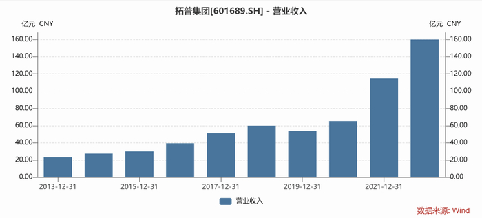 拓普2016年就进入了特斯拉供应链,成为特斯拉核心供应商,随着2020年后新能源车爆发,成就了一批巨头公司,比如特斯拉、比如比亚迪。传统汽车是周期行业,而新能源车的爆发,直接给行业带来了巨大的成长属性,不止特斯拉受益,作为供应商的拓普也在这一轮新能源车爆发中完成蜕变成长,成为营收近160亿的汽车零部件公司。
