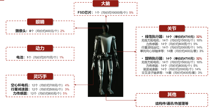 人形机器人主要由头部、关节、灵巧手、眼睛、躯干等环节构成。其中关节是人形机器人中最核心的部分,也是价值量最高的环节,关节决定了机器人的灵活性和自由度,执行器就是人形机器人的关节,旋转执行器就是旋转关节,线性执行器就是大腿、小腿等直线关节。