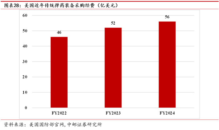 公司自成立以来深耕于小口径、中口径各类型弹药的科研生产,并逐渐发展成为以小口径防空反导弹药为特色,多类型中、小口径弹药同步发展的新型弹药企业。火炮长期被誉为“战争之神”,与导弹各有所长,作为历代战争中的火力骨干,一直是战场上不可或缺的组成部分。美国弹药采购持续增长,2024财年弹药采购经费预算达56亿美元,我们预计,我国目前弹药市场规模约为111亿元/年。在小口径防空反导弹药领域,从现有订货规模、技术水平及综合能力来看,公司处于行业领先地位,在新型低成本无人机等空袭威胁下,高炮成为高效拦截手段,有望保持较快发展。