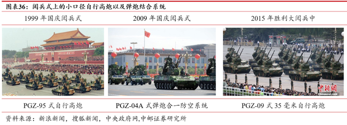 经过几十年的发展,我军在役高炮已形成了舰载、车载、履带式、轮式、轻型高机动为平台的多型25mm、30mm和35mm高炮及弹炮结合系统,主要用于末端防御和机动伴随防空掩护任务。1999年国庆50周年阅兵式上,95式4管25毫米自行高炮首次公开;2009年国庆60周年阅兵式上出现的是经过大幅改进的04A式弹炮合一防空系统;在2015年纪念中国人民抗日战争暨世界反法西斯战争胜利70周年阅兵式上,我国新一代09式双管35毫米自行高炮首次登场。