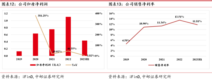 2022年,公司实现归母净利润1.11亿元,同比增长47%,销售净利率为13.51%,同比提升2.16pcts,近年公司净利率实现稳步提升。