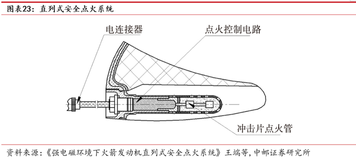 直列式安全点火系统起爆条件严苛,工作可靠性高。直列式安全点火系统是继机械式、机电式安全系统之后的第三代安全系统,主要由电连接器、点火控制电路和冲击片点火管等组成。冲击片点火管使用钝感点火药硼/硝酸钾,这类火工品起爆条件严苛,需要几千伏/几千安的高能才能激发,抗电磁干扰能力优越,具有极高的工作可靠性。