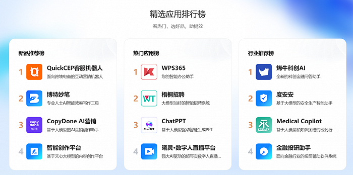 比如百度智能云的千帆AI原生应用商店,就上线了百度曦灵数字人直播平台、comate代码助手这类百度自己出品的应用,也有来自合作伙伴WPS365、梧桐招聘助手等应用,并上线了应用精选推荐。