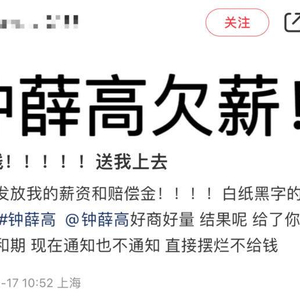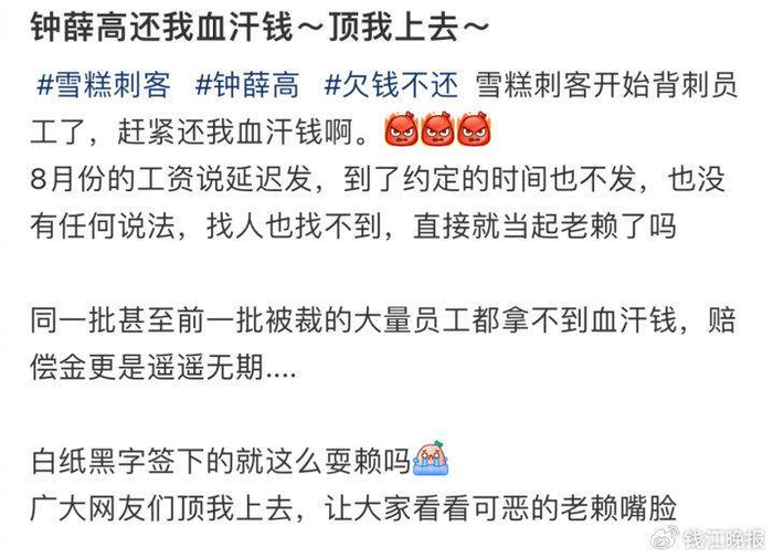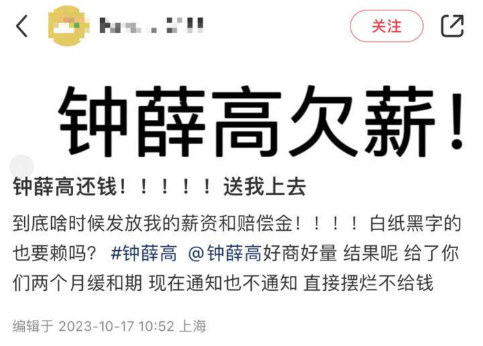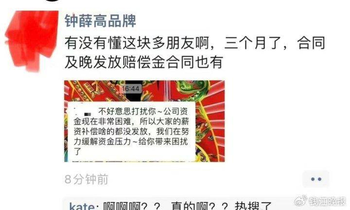 有自称钟薛高客服部门“前员工”的网友表示,在公司效益不好优化期间,该员工等6人与公司人事提出优化补偿,并签署了离职同意单,约定补偿金和工资10月15日发放,当天公司未履约。该员工讨要说法,“公司回复账户上没有钱补偿,说要等,没有具体的时间点。”