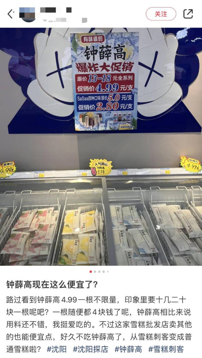 不少网友发现,线下渠道的钟薛高也在“甩卖”。“原价13元至18元不等的全系列雪糕,促销价4.99元一支。‘雪糕刺客’变普通雪糕了?”有网友疑惑道。