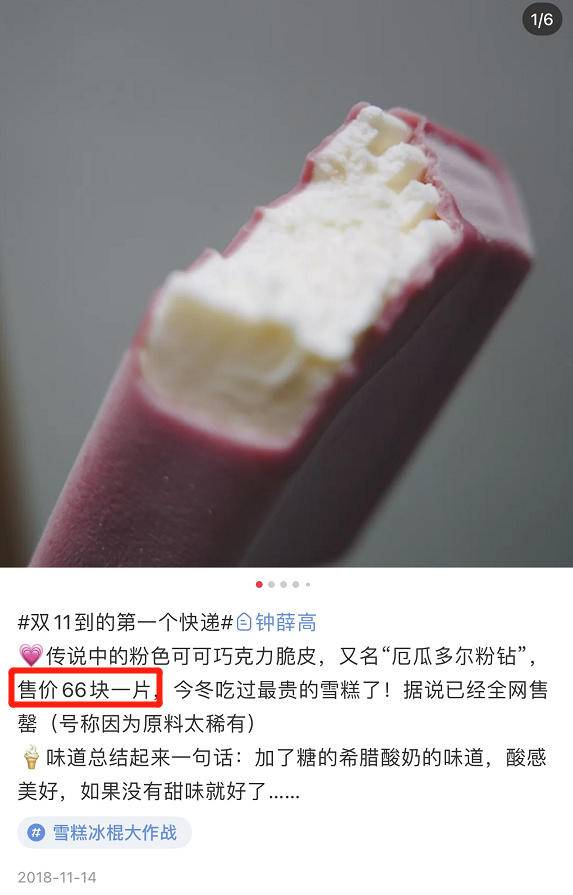 例如,2018年“双十一”期间,售价66元的“厄瓜多尔粉钻”冰淇淋限量发售2万支。同时,钟薛高还邀请了厄瓜多尔驻华总领事馆的领事品尝美食,成为别具一格的代言人。