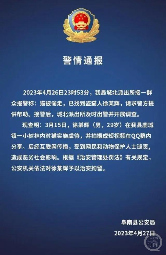 公开资料显示,“杰克辣条”原名徐志辉,安徽阜阳市阜南县人,曾于2022年7月份获得“阜南好人”特别奖。今年4月27日,阜南县公安局发布警情通报:经查明,3月15日,徐某辉(男,29岁)在阜南县鹿城镇一小树林内对猫实施虐待,并拍摄成短视频在QQ群内分享。后经互联网传播,受到网民和动物保护人士谴责,造成恶劣社会影响。根据《治安管理处罚法》有关规定,公安机关依法对徐某辉予以治安拘留。当天下午,徐志辉在网上发布致歉信,称“感到非常羞耻、懊悔和抱歉。”今年5月,阜南县文明办发布公告,取消徐志辉“阜南好人”特别奖称号。