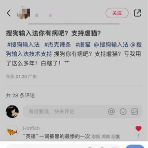 近日,因为成都一条罗威纳犬咬伤2岁小孩事件,网络上有关猫狗等小动物的讨论很多。在某社交平台上,不少网友发帖表示,在手机上用搜狗输入法输入“杰克辣条”(网红博主,后因虐猫拍摄视频传播被拘留)时,会自动跳出“除猫英雄”这4个字。不少网友进行了验证,发现的确如此,引发争议。20日上午,搜狗输入法客服回应上游新闻(报料邮箱baoliaosy@163.com)记者称:“这个问题已经在处理中了,暂时不清楚具体原因。”