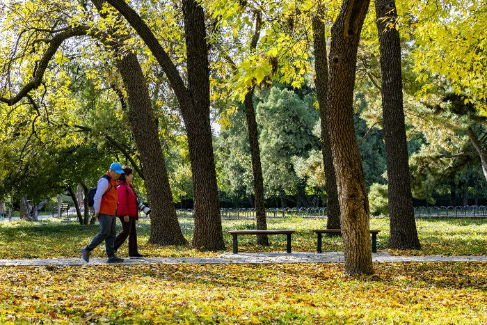 10月19日,北京碧空如洗,天坛公园祈年殿的蓝色琉璃瓦在阳光下熠熠生辉。