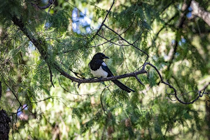 喜鹊站在树枝上。