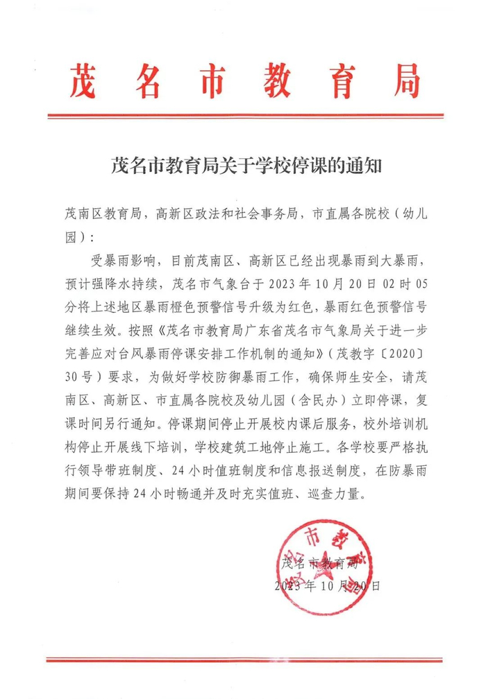 10月20日,广东茂名市教育局发布通知称:为做好学校防御暴雨工作,茂南区、高新区、市直属各院校及幼儿园(含民办)立即停课,复课时间另行通知。