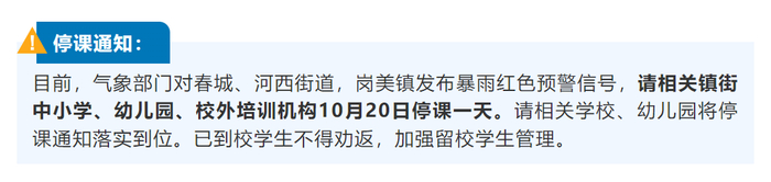 10月20日,据“阳春融媒”消息,目前,气象部门对广东阳江阳春市春城、河西街道,岗美镇发布暴雨红色预警信号,请相关镇街中小学、幼儿园、校外培训机构10月20日停课一天。请相关学校、幼儿园将停课通知落实到位。已到校学生不得劝返,加强留校学生管理。