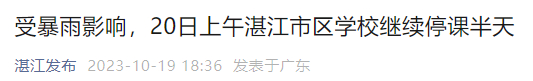 受降雨影响,我市市区多条道路积水,为确保广大师生生命财产安全,经综合研判,决定10月20日上午湛江市区学校继续停课半天,复课时间将视天气状况及市区路面积水情况另行发布,请各学校通过各种途径提醒家长做好学生安全监管工作。