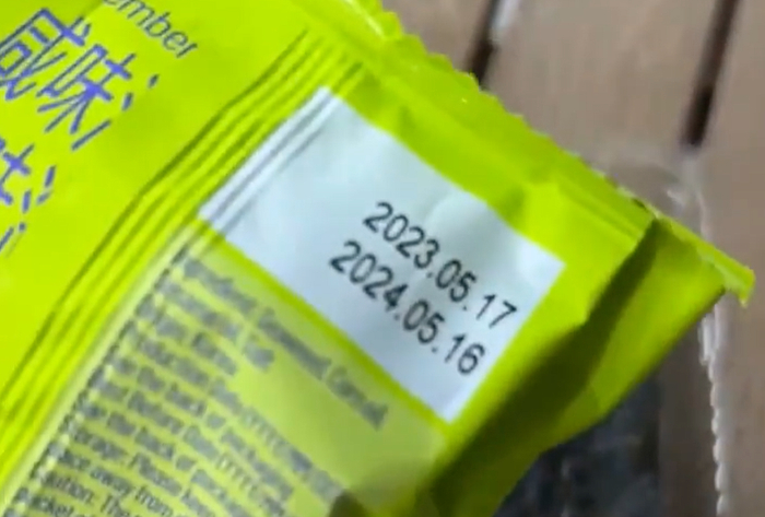 但是,根据包装上的生产日期显示,该盒海苔在2023年5月17日生产,保质期为1年,事发当时仍在保质期之内。