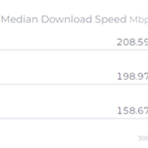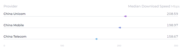 在各运营商宽带下载速度方面,中国联通以208.59Mbps的中位数下载速度排名第一,中国移动和中国电信位居第二和第三,速度分别为198.97Mbps和158.67Mbps。