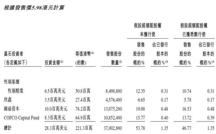 锅圈是次IPO引入4名基石投资者,合共认购2830万美元的发售股份,其中恒顺集团通过恒顺醋业(600305.SH)认购650万美元、恒顺集团通过全资子公司欣鑫认购350万美元、秦英林和钱瑛夫妇的牧原集团通过全资子公司钟鼎资本认购1000万美元、中粮资本(002423.SZ)通过COFCO Capital Fund认购830万美元的发售股份。