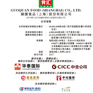 锅圈,计划全球发售6880.28万股H股,其中90%为国际发售、10%为公开发售,另有15%超额配股权。每股发售价5.98港元,每手400股,最多募资约4.11亿港元。