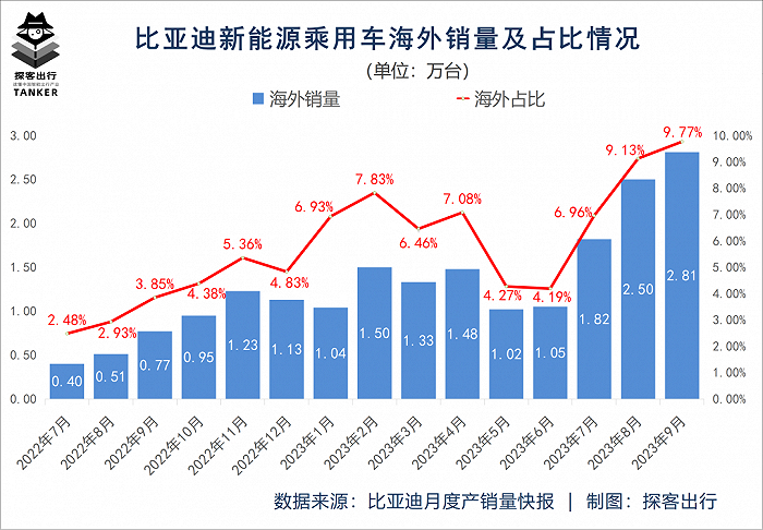 即便是9月海外乘用车销量再创历史新高,单月出海达2.80万台,但在比亚迪乘用车销量单月的占比也只有9.77%,前三季度的海外累计销量占比也仅有7.03%。
