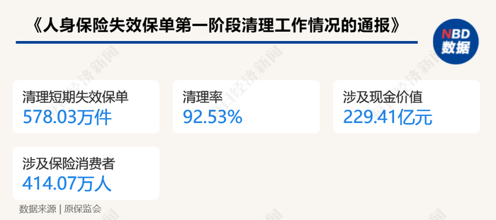 从《人身保险失效保单第一阶段清理工作情况的通报》发布的成果看,截至2014年底,共清理短期失效保单578.03万件,清理率为92.53%,涉及现金价值229.41亿元,涉及人身保险公司61家,涉及保险消费者414.07万人。