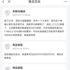 据消费者张先生反映,目前他正处于考研的关键阶段,购买的“暗影精灵9”笔记本电脑出现黑屏问题后,其向惠普公司售后反映了情况并将电脑寄送至惠普公司售后检测、维修超20天,至今仍未完成维修。电脑无法使用,已严重影响到他的正常学习和生活。