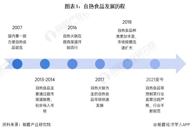 自热食品早期主要是满足军事行动和野外作业需要,近几年拓展到民用领域。自热型饭菜产品早在2007年就已经有企业在开发,2013-2014年,市场进入导入阶段。2016年下半年,自热火锅开始在网络平台上进行发酵,进入大众视野,2017年双十一自热火锅销量惊人,彻底引起了消费者的关注,自热食品市场彻底爆发。2021年后,自热食品等预制菜行业监管日趋严格,行业不断规范。